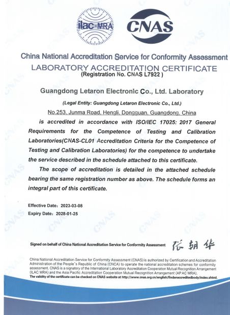 Letaron, kaliteli bir teknoloji araştırma merkezi kurdu ve yurtdışındaki yetkili sertifika kuruluşlarıyla istikrarlı işbirliği ilişkileri kurdu.Bir tıklama noktasından test ve sertifikasyon hizmetleri sağlayabilen yukarı ve aşağı akıştaki işletmeler2021 yılında, Sanayi ve Bilgi Teknolojisi Bakanlığı tarafından Ulusal Kalite Altyapısı (NQI) tek durak hizmet platformu olarak değerlendirildi.Bu Letaron için eşsiz bir rekabet avantajı haline geldi..